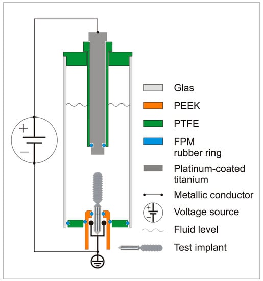 The implants in groups 1, 3, and 5 were cleaned by an electrolytic process. Figure 3 shows the construction of the electrolytic chamber. After demasking of the biofilm-coated test implant with a customized ejector, the implant was mounted on the bottom of the electrolytic chamber with a customized connector. The test implant served as the cathode. The connector had an inner titanium sleeve (titanium grade 4) covered by an insulating polyetheretherketone (PEEK) carrier. The inner titanium sleeve was connected to the electric source, and the PEEK carrier masked the carrier part of the test implant for only three quarters. This design was chosen to guarantee that it was possible to separate the test specimen using a customized tool, without touching the PEEK carrier, which was not been cleaned during the electrolytic procedure. The connector was mounted in a polytetrafluoroethylene (PTFE) socket to ensure stability of the electrolytic chamber.