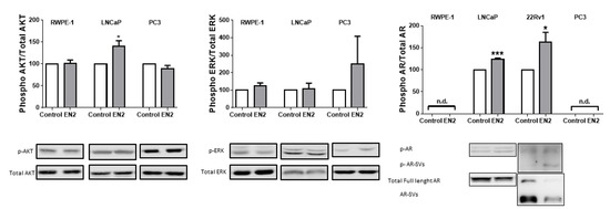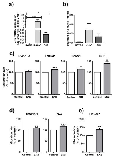 3.2. EN2 Is Overexpressed, Secreted, and Modulates Aggressiveness Features in PCa Cells