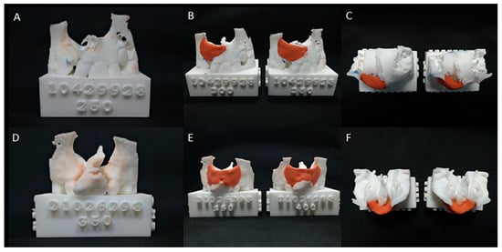 The 3D-printed models for alveolar bone graft surgery simulation. (A) Unilateral alveolar cleft models displaying (B) the superior, inferior, (C) anterior, and posterior borders of unilateral alveolar cleft defects filled with simulated bone graft tissue (red modeling clay) in two models with different densities of computed tomography (CBCT) from the same patient with complete unilateral cleft lip and palate. (D) Bilateral alveolar cleft models displaying (E) the superior, inferior, (F) anterior, and posterior borders of a bilateral cleft defect filled with simulated bone graft tissue (red modeling clay) in two models with different densities of CBCT from the same patient with complete bilateral cleft lip and palate.
