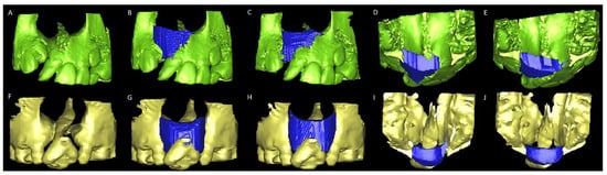 Virtual models for alveolar bone graft surgery simulation. (A) Unilateral alveolar cleft models displaying (B,C) the superior, inferior, (D,E) anterior, and posterior borders of bone defects filled with simulated bone graft tissue (blue) in two models with different densities of CBCT from the same patient with complete unilateral. (F) Bilateral alveolar cleft models displaying (G,H) the superior, inferior, (I,J) anterior, and posterior borders of bone defects filled with simulated bone graft tissue (blue) in two models with different densities of CBCT from the same patient with complete bilateral cleft lip and palate.