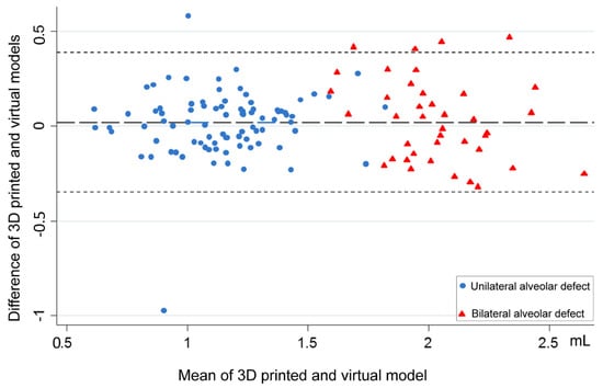 This study is not without limitations. The current sample restricted patients according to their age at the time of undergoing secondary ABG procedures, with extrapolations for primary or tertiary ABG procedures requiring careful interpretations. The difference in alveolar cleft volume between patients with and without presurgical regional orthodontic treatment were not assessed, which is a topic deserving of future study with a larger sample size. The absence of simulated soft tissues (nasal floor, palatal, and gingival tissues) does not limit simulated ABG surgeries because the examiners can easily identify the extent of the defect, including the confluence of the structures in the posterior region, which constitutes a challenging area in actual surgery. Further studies may consider the soft tissue perspective when using the described models. Additional investigation is also required to provide a cost-effectiveness analysis for facilitating the decision-making process of ABG care. Education-based research involving numerous surgeons with various levels of expertise should assess the impact of the described methods with financial, logistic, and time constraints in teaching cleft ABG surgery. Structured surveys may also reveal the preferences and perceptions of trainees and surgeons when performing ABG procedures using the 3D printed and virtual models. Although it was demonstrated that both 3D printed and virtual models may be interchangeably used for the measurement of alveolar cleft volume, a clinically controlled trial is required to test the present findings according to the clinical reality. For this, it is reasonable to apply the current unilateral and bilateral cleft defect-specific volumetric data for future ABG surgery-based research, with anatomy-related aspects being evaluated intraoperatively on a case-by-case basis. This may potentially reduce the operative time and donor site-related morbidity and thus also merit future investigation.