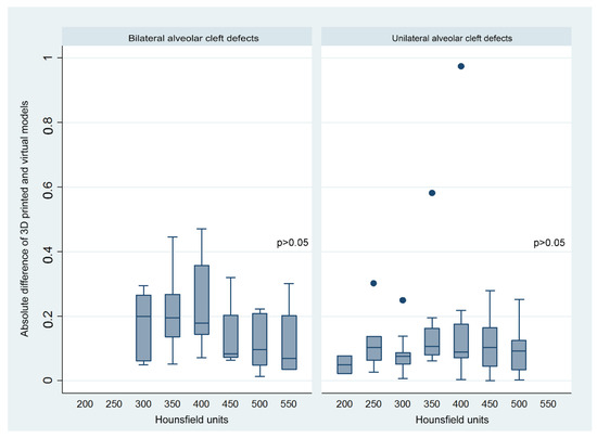 The absolute difference between 3D-printed and virtual-based surgical simulation methods showed no linear relationship with different Hounsfield units adopted for bilateral and unilateral alveolar cleft defects.