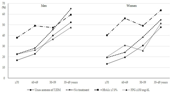 Awareness, treatment, and control of T2DM according to age groups are shown in Figure 1 and Table 3. The proportions of adults who were unaware of having and were not undergoing treatment for T2DM were significantly higher among younger participants across both sexes. After adjusting for confounding variables, the odds of unawareness and non-treatment of T2DM increased with younger age in both sexes (p for trend <0.001). Adjusted ORs for poor glycemic control were 2.45 (95% CI: 1.33–4.48) for HbA1c ≥ 7.0% and 2.95 (1.55–5.61) for FPG ≥ 150 mg/dL among men aged 35–49 years, as compared with those aged ≥70 years. In women, these ORs were 2.31 (95% CI: 1.20–4.47) for HbA1c ≥ 7.0% and 3.98 (2.02–7.84) for FPG ≥ 150 mg/dL. Odds of poor glycemic control tended to be higher among younger age groups in both sexes.