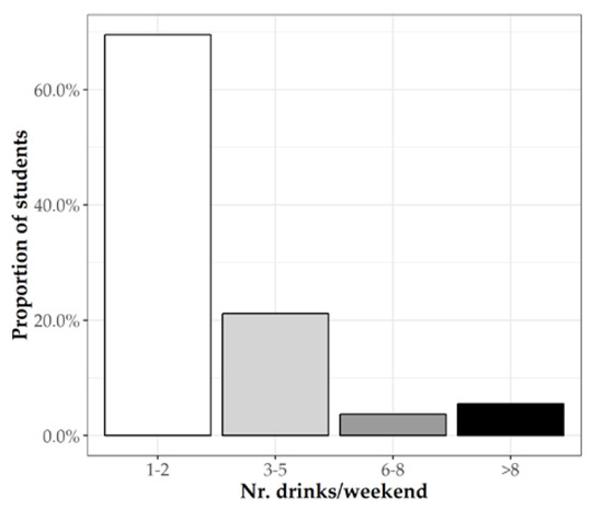 According to alcohol consumption, only 25 students (9.3%) declared a consumption of ≥6 drinks per weekend (Figure 2).