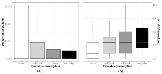 (a) Frequency of cannabis consumption among students and (b) the association between alcohol and cannabis consumption.