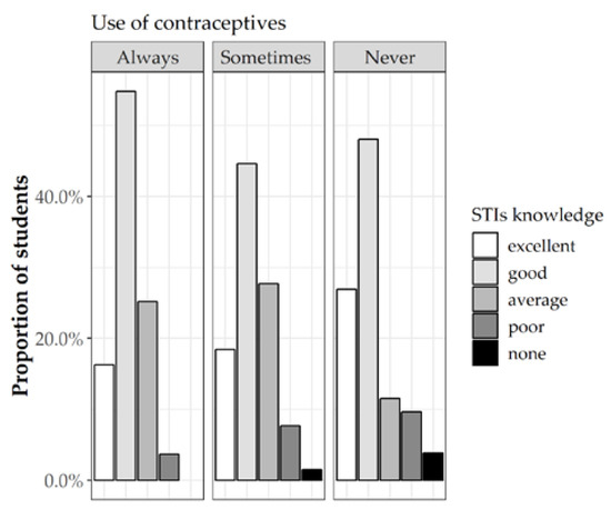 Interestingly, 242 (53.5%) of the 360 sexually active students examined admitted they use condoms; 65 students (25.6%) used contraceptive sometimes, while the remaining 53 (20.9%) declared they had never used them. Most of the students reported sufficient information about STIs: 61 students (17.7%) showed excellent knowledge, while 169 (49.0%) reported good knowledge. Surprisingly, these percentages were higher among those not using contraceptives at all (Figure 5).