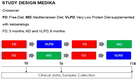 Study design: FD = free diet, VLPD = very low protein diet, MD = Mediterranean diet.