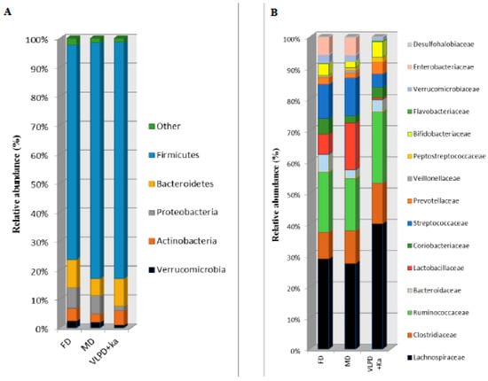 Bacterial phyla and families associated to dietary regimens in intestinal microbiota of chronic kidney disease (CKD) patients. Average of relative abundance (%) of bacterial phyla (A) and families (B) which were found in the fecal samples of patients with free diet (FD), Mediterranean diet (MD), or very low protein diet supplemented with alphaKappa (VLPD + Ka). Only phyla showing statistical differences (p < 0.05) in at least one dietary regimen were reported.