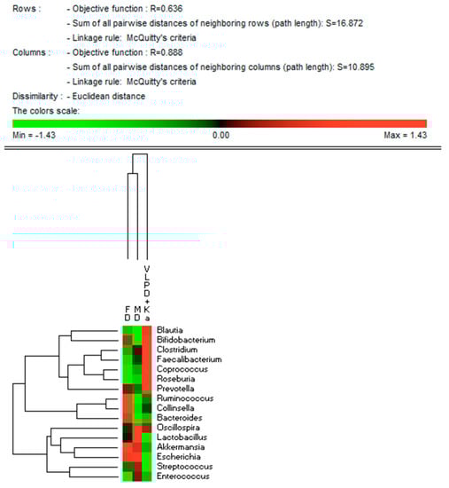Since no data were present in the current literature regarding the effects of diet regimens, no sample size estimation was carried out. Variables were presented as the mean ± standard deviation (SD), median (interquartile range), or count (percentage) as appropriate. Differences between diet regimens were evaluated by Student’s t-test or Wilcoxon rank sum test for normally and not-normally distributed variables, respectively, as appropriate. All analyses were conducted as intention-to-treat. Two-tailed p < 0.05 values were considered statistically significant. Analyses were completed using R version 3.1.3 (2015-03-09) (The R Foundation for Statistical Computing, Vienna, Austria). StatView software package SAS, 5.0 version, was used for linear regression analysis determining the correlation between variables. Metagenomic data (UniFrac distance metric and taxonomic abundance) were analyzed by principal component analysis (PCA) [24,25] using the statistical software Statistica for Windows (Statistica 6.0 for Windows 1998, StatSoft, Vigonza, Italy). Measures of diversity were screened for group differences by using analysis of variance (ANOVA). PermutMatrixEN software was used to identify clusters at the level of the sample groups and taxa [26]. Spearman correlations between OTU and metabolite concentration were computed. All analyses were conducted in R, using the vegan, labdsv, DESeq2, and phyloseq packages.
