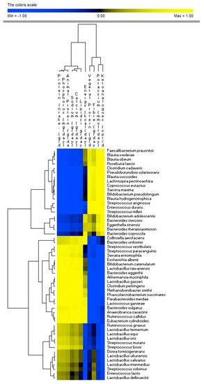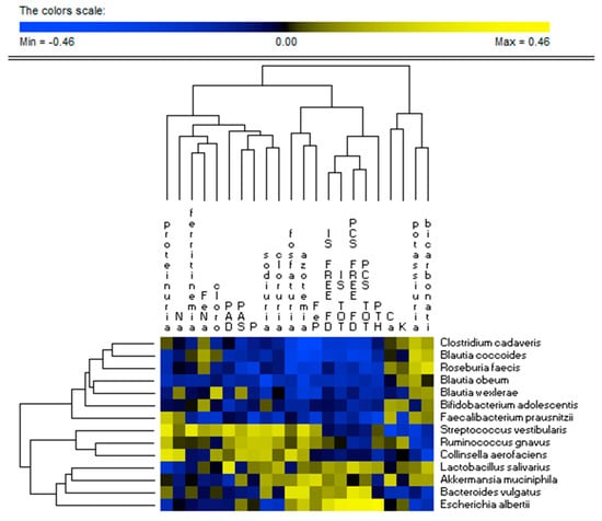 Correlations between bacterial species and dietary intake of CKD patients. The colors of the scale bar denote the nature of the correlation, with 1 indicating a perfectly positive correlation (yellow) and −1 indicating a perfectly negative correlation (blue) between species and dietary intake. Only significant correlations (FDR, 0.05) are shown.