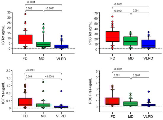 VLPD is very effective in reducing both total and free IS (2.8 ± 2.8 µg/mL, p < 0.0001; 0.08 ± 0.12 µg/mL, p < 0.0001) and PCS (10.1 ± 8.8 µg/mL, p < 0.0001; 0.28 ± 0.4 µg/mL, p < 0.0001) serum levels as compared to FD (IS: 9.2 ± 6.7 µg/mL; 0.3 ± 0.3 µg/mL. PCS: 24.0 ± 13.4 µg/mL; 0.97 ± 0.98 µg/mL). MD is also able to decrease the serum levels of total and free IS (5.9 ± 6.1 µg/mL, p = 0.002; 0.18 ± 0.2 µg/mL, p = 0.003) and PCS (14.8 ± 9.4 µg/mL, p < 0.0001; 0.54 ± 0.6 µg/mL, p = 0.001) as compared to FD, although to a lesser extent than s-VLPD (Figure 5). Total and free IS and PCS serum levels were positively correlated with azotemia (r = 0.44, p < 0.0001; r = 0.46, p < 0.0001; r = 0.37, p < 0.0001; r = 0.39, p < 0.0001, total and free, respectively) (Figure 6). A wider variation of the azotemia, total IS and PCS between VLPD and FD compared to that between MD and FD was found, as well as a mild positive correlation between the variation of azotemia, and the variation of total IS (r = 0.2, p < 0.03) and PCS (r = 0.22, p < 0.01).