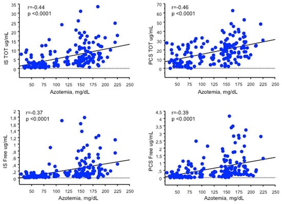 Correlations between the serum levels of (A) total indoxyl sulfate (IS TOT), (B) total p-cresyl sulfate (PCS TOT), (C) free indoxyl sulfate (IS free), (D) free p-cresyl sulfate (PCS free) and azotemia.