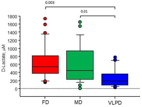 Circulating D-lactate was measured in serum samples of patients following FD, MD, and VLPD, as a marker of intestinal permeability. VLPD significantly reduced D-lactate in CKD patients (188.3 μM (83.0–364.1 μM)), in comparison with FD [542.3 μM (368.1–836.1 μM), p = 0.001] and MD (448.5 μM (225.3–931.3 μM), p = 0.04)). MD treatment showed significant variation of D-lactate levels in comparison with FD. D-Lactate levels directly correlated (r = 0.3, p = 0.002) with blood urea nitrogen levels (Figure 7).