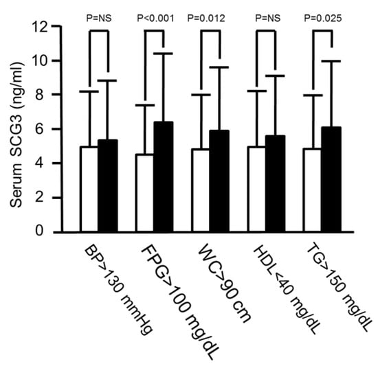 To the extent of our knowledge, this is the first report providing evidence that serum SCG3 levels are higher in subjects with MetS. Specifically, there were higher serum SCG3 levels in subjects with high FPG levels, larger WCs, or hypertriglyceridemia. Additionally, the presence of MetS, FPG, FFAs, and WC were independently associated with serum SCG3 levels after adjusting for the insulin level, hsCRP, and other cardiovascular risk factors.