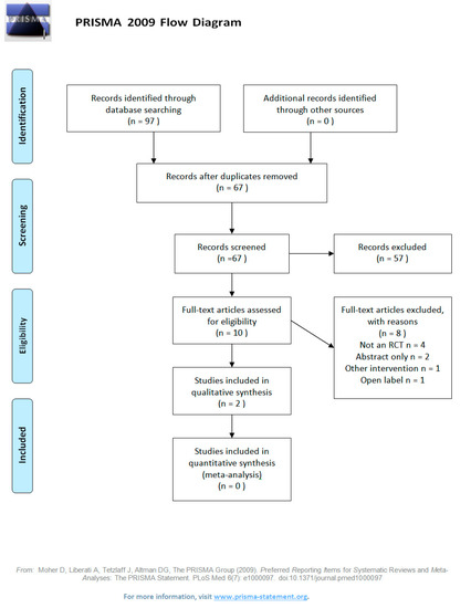 Ninety-seven titles were retrieved from all the searches and after removing duplicates, there were 67 original papers. Studies were excluded during screening (n = 57) for various reasons: different conditions, pediatric cohorts, different interventions, healthy population, or other (animal trial, non-English, review article), as shown in Figure 1 (PRISMA flow diagram). During the full text review of the remaining 10 papers, reasons for exclusion included: non-randomized controlled trial (non-RCT) design (4/8), abstract only (2/8), an open label study design (1/8), and different interventions (1/8).