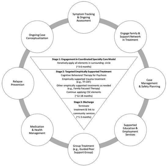 Integration of Cognitive-Behavioral Therapy for Psychosis and Empirically Supported Trauma Treatment within Coordinated Specialty Care: A Three-Stage Model. Note. CSC = Coordinated Specialty Care; This figure represents the three-stage approach to integrating Cognitive Behavioral Therapy for Psychosis and empirically supported trauma treatments within CSC. Key components of CSC are depicted in the outer circle as they should continue throughout the three stages. The three stages build upon one another, with each serving as a necessary foundation for subsequent stages.