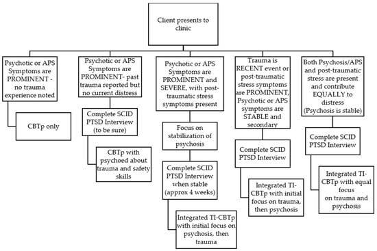 Decision tree to guide clinical approach. Note. APS = Attenuated positive symptoms; CPTp = Cognitive-behavioral therapy for psychosis; SCID = Structured Clinical Interview for DSM Disorders; PTSD = Post-traumatic stress disorder; TI-CBTp = Trauma-integrated cognitive-behavioral therapy for psychosis.