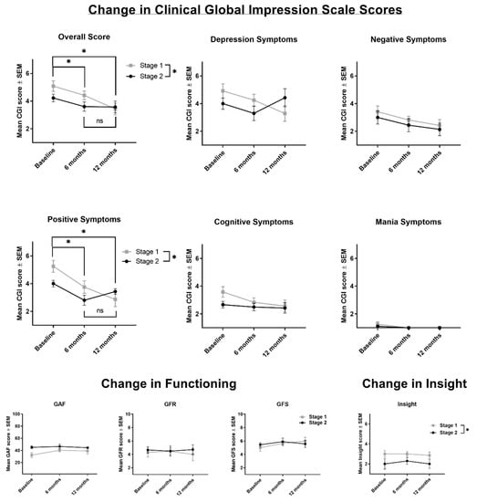 Ordinal logistic regressions were used to assess differences in changes in symptoms and functioning over time between Stage 1 and Stage 2 clients. Time point (baseline, 6 months, and 12 months) and stage (Stage 1 or 2) were the predictors in the model for each outcome variable (Clinical Global Impressions Scale, Global Functioning Social and Role Scales, Insight).