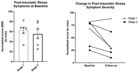 Post-traumatic stress symptom severity at baseline (Stage 1: n = 6; Stage 2: n = 6) and 6-month follow-up (Stage 1: n = 2; Stage 2: n = 4). Post-traumatic stress symptoms were measured on the UCLA PTSD Reaction Index or the Child and Adolescent Trauma Screen (for minors), or the PTSD Checklist for DSM-5 (for adults). Scores were normalized to the maximum score for each respective measure.
