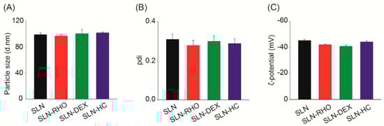 The quality of SLN, SLN–RHO, SLN–DEX and SLN–HC preparations was evaluated measuring particle size, pdi and ζ-potential values. As shown in Figure 1, all SLNs presented similar values for the three parameters. Therefore, the addition of dexamethasone or hydrocortisone did not alter the characteristics of the nanoparticles. Similarly, incorporation of the fluorescent probe did not modify particle parameters. Specifically, the particle size and pdi values of all SLNs were around 100 nm and 0.3, respectively. Sizes below 150 nm, as shown by these SLNs, are optimal to achieve good uptake rates [21,34], whereas pdi values of 0.3 are considered adequate for drug delivery applications using lipid-based carriers [21]. Regarding ζ-potential, all SLN showed values around −44 mV that ensure the stability of the SLN preparation.