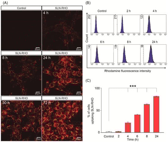 Uptake of SLN–RHO into HEI-OC1 cells. (A) HEI-OC1 cells were incubated with 250 µg/mL of rhodamine-loaded SLN (SLN–RHO). Fluorescence intensity of incorporated SLN–RHO was detected by confocal microscopy at the times indicated. Representative microphotographs from three independent experiments are shown. (B) HEI-OC1 cells were incubated with SLN–RHO (250 µg/mL) for different times, cells were then collected, and the fluorescent intensity of incorporated SLN–RHO was detected by flow cytometry. The plots shown are representative of three independent experiments, whose quantification is shown in (C). Data are shown as the mean ± SEM from three independent experiments. One-way ANOVA was used to determine statistical significance; ***p < 0.001.