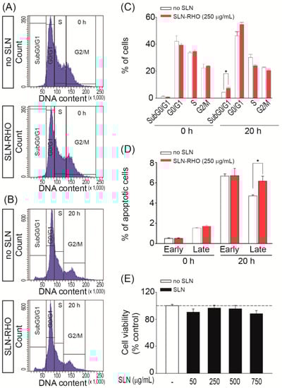 The cytotoxicity of SLN–RHO and SLN in HEI-OC1 cells. (A) Flow cytometry analysis of cell cycle phase distribution in HEI-OC1 cells. Representative profiles of DAPI staining from control (no SLN) and SLN–RHO (250 µg/mL) treated cell cultures, at 0 h (A) and 20 h (B). (C) Histogram showing the cell distribution in the sub-G0/G1, G0/G1, S and G2/M phases in control and SLN–RHO (250 µg/mL) treated-cells. (D) HEI-OC1 cells were incubated or not with SLN–RHO for 20 h, stained with FITC-conjugated Annexin V and PI, and the pencentages of cell populations in early and late apoptosis were quantified. Data are shown as the mean ± SEM from three independent experiments. The significance of the differences was evaluated using Student´ t tests; *p < 0.05 versus control condition (without SLNs). (E) HEI-OC1 cells were seeded into 96-well microplates 1500 cells/well and treated with the doses indicated of SLN for 24 h. Cell viability was determined with the Cell Proliferation Kit II (XTT) assay. Results are the mean ± SEM of two-three independent experiments performed in quadruplicate. The significance of the differences was evaluated using one-way ANOVA testing; * p < 0.05.