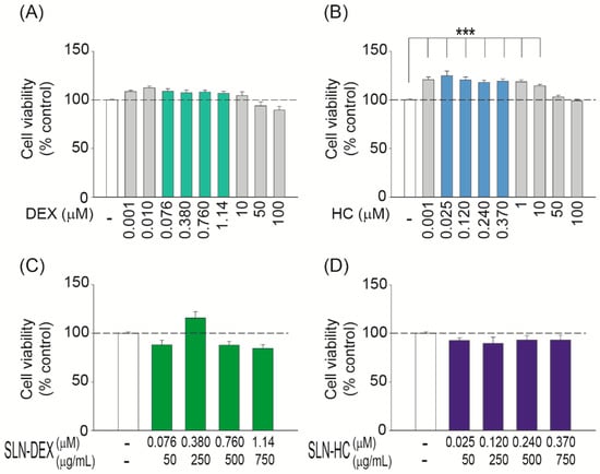 Glucocorticoids are the treatment of choice for a variety of hearing loss conditions because they are anti-inflammatory drugs that promote cellular survival [35,36]. Glucocorticoid receptors are intracellular and bind with different affinities to different synthetic molecules, dexamethasone being approximately 27 times more potent than hydrocortisone at the same dose [37,38]. Therefore, next, we made a comparative study between treatments with glucocorticoids alone or loaded into SLNs. HEI-OC1 cells were serum-deprived for 24 h and then treated with increasing doses of dexamethasone or hydrocortisone for 24 h (Figure 4A,B). The dose range was from 0.001 to 100 µM for both glucocorticoids and cell viability was evaluated with the XTT assay. Cells treated with dexamethasone did not show any difference with respect to untreated cells (Figure 4A). Hydrocortisone-treated cells showed a limited but significant increase in cell viability (Figure 4B). Similarly, HEI-OC1 cells were treated with dexamethasone or hydrocortisone loaded into SLNs (SLN–DEX and SLN–HC, respectively) during 24 h. Dose responses of glucocorticoid loaded SLNs, 50 to 750 µg/mL, were carried out, which corresponded to doses in the range 0.076–1.14 µM of dexamethasone (Figure 4C) and 0.025–0.370 µM of hydrocortisone (Figure 4D). Cell viability was not decreased by either SLN–DEX (Figure 4A,C, green bars) or SLN–HC (Figure 4B,D, blue bars) treatments over a wide dose range.