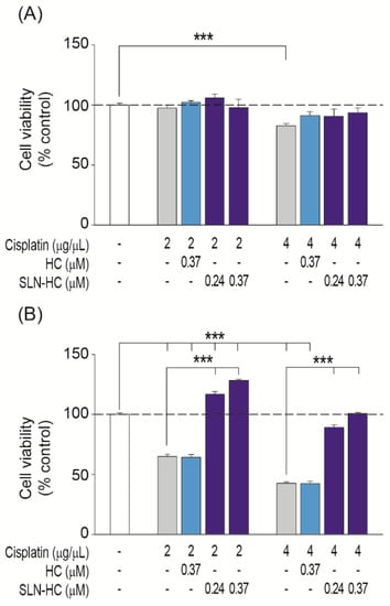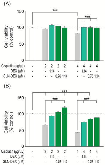 Cells were pre-treated with glucocorticoids (dexamethasone or hydrocortisone) free or incorporated into SLNs (SLN–DEX or SLN–HC) for 24 h; 500 µg/mL loaded SLNs contained either 0.760 µM DEX or 0.240 µM HC, whereas 750 µg/mL loaded SLN contained 1.14 µM DEX or 0.370 µM HC. Then cisplatin (2 or 4 µg/mL, Accord Healthcare Limited, Middlesex, UK) was added to each well. Cell viability was determined 24 and 48 h after cisplatin addition. The biological effects of dexamethasone and hydrocortisone were compared with the effects of SLN–DEX and SLN–HC, respectively, in control (without cisplatin) and ototoxic (with cisplatin) conditions. Cell viability was determined as above.
