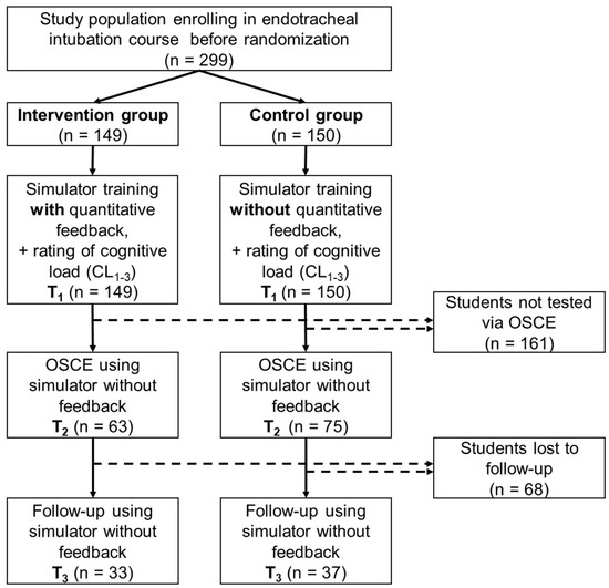 The study commenced with a training session to learn the endotracheal training procedure (January/February, 2015). The training—as a first point of data collection (T1)—was held by four peer student tutors trained by two study team members (anesthesiologists) in advance. To make the training sessions comparable, all four peer student tutors were trained together based on predefined learning objectives and a handout giving a detailed course structure for the training sessions. The student tutor to student ratio was 1:5 max. Students had to enroll independently in the courses online. The different course dates were randomized in blocks to one of the two study arms: “training with additional feedback” (intervention group) and “training without additional feedback” (control group). The result of the randomization was unknown to the students up to the beginning of the course. The duration of the course was 60 min. At the beginning of the session, all students who consented to participate in the study received a questionnaire and a numeric code card to save the outcomes anonymously. The course itself started with a theoretical introduction by student peers to activate prior knowledge. The repetition of material necessary for endotracheal intubation as well as procedure indications were reviewed. Afterwards, the students were asked to record their individual cognitive load on the cognitive load rating scale for the first time during the training session (baseline—Measurement point CL1) [22]. In the next step, the “Difficult Airway Management Simulator Evaluation System” was introduced. The procedure of endotracheal intubation was explained step-by-step using the simulator, and typical problems and complications were discussed. Depending on whether the group was part of the intervention or the control group, the visual and quantitative feedback of the simulator’s monitor was shown to the trainee (intervention) or not (control). After this session, students had to record their individual cognitive load once again (measurement point CL2). The final part of the course focused on the practical training of the procedure and lasted for at least 40 min. For the practical training, the visual and quantitative feedback of the monitor was used or blinded for both the trainees and tutor. Every student had the chance to practice the procedure several times. Afterwards, the students had to record their individual cognitive load for a third and final time (measurement point CL3). The last training attempt was used for data evaluation. Verbal feedback and helpful hints were given by the student tutors in both groups. For the demonstration, training and later measurements of the procedure, a laryngoscope with a Macintosh-blade (size 4) was used.
