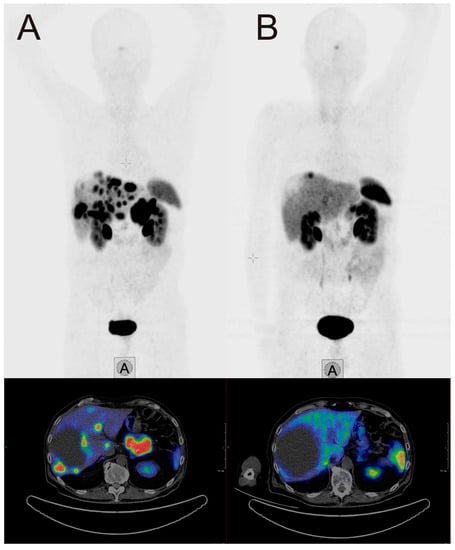 Example of a 70-year-old male patient with a pancreatic neuroendocrine tumor (NET), first diagnosed in April 2017, with an initial ki-67 index of 3%. After initial treatment with everolimus, liver metastases showed progress in November 2017. (A) SSTR-PET/CT at this time point. The patient was treated with four cycles 177Lu-DOTATATE (total dosage 29.3 GBq) between November 2017 and July 2018. Two months after the last cycle, SSTR-PET/CT (B) showed a very good response. Chromogranin dropped in the same interval from 1004 µg/L to 140 µg/L.