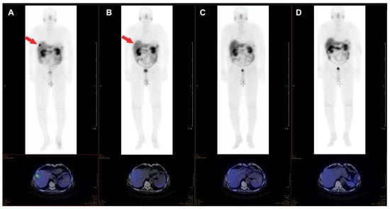 Example of a 76-year-old male patient with pancreatic NET, first diagnosed in 2012, with an initial ki-67 index of 15% who underwent four cycles of treatment with 177Lu-DOTATATE (cumulative dose 28.8 GBq) between October 2017 and July 2018, due to progression of bilobar liver metastases. The liver metastasis clearly visible in the post-therapy scan of the first cycle (A) is just barely visible in the scan of the second cycle (B) and not visible anymore in the scans of the third (C) and fourth (D) cycle. In the PET/CT images acquired six and twelve months after the last cycle, no tumor tissue was identified.
