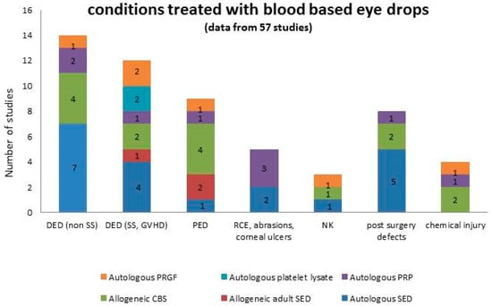 Summary of the conditions treated with blood-based eye drops, graphed in columns where each colour represents a specific product. Numbers in the columns represent the number of studies.