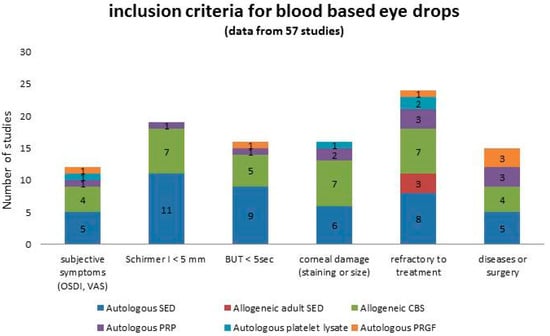 Inclusion criteria considered for a given patient to enter a therapeutic program with blood-based eye drops are summarized in Figure 2. To be refractory to previous treatment (ranging from tear substitutes to therapeutic soft contact lenses, topical steroids, and 0.05% cyclosporine) was the most represented indication for the prescription, followed by severely impaired parameters of tear functions and subjective symptoms of discomfort indicating severe dryness. Despite an increasing interest in other disciplines concerning the application of blood-based products to pursue reduction of pain [124], no indication of the prescription of blood-based eye drops focused on ocular pain relief was found.