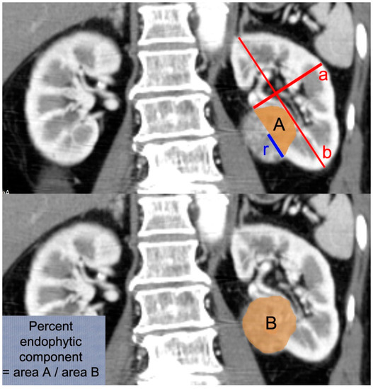 Measurements of the study. Kidney volume was estimated as cylindrical volume using the short (a) and long diameter (b) of the kidney on the three-dimensional computerized tomography (CT) image. The tumor volume was estimated as a ball with its radius of maximal tumor radius (r). Percent endophytic component was measured as a percentage ratio of endophytic tumor area (A) to whole tumor area (B) on the CT image where the maximal tumor area was observed.
