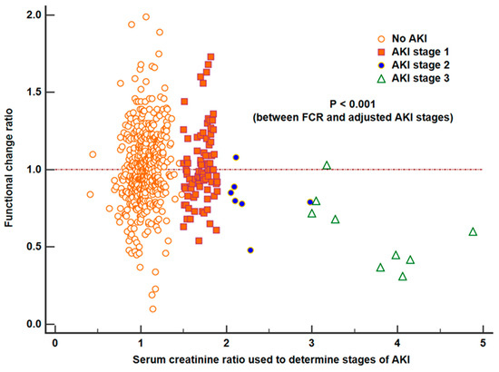 Distribution of long-term functional change ratio (FCR) across the different serum creatinine ratios used to determine acute kidney injury (AKI) stages. There was a significant correlation between FCR and adjusted AKI stages (p < 0.001).