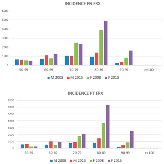 Incidence of the femoral neck (FN) and pertrochanteric (PT) fracture in different age groups, compared between men and women, in the years 2008 and 2015.