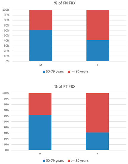Percentage of the femoral neck (FN) and pertrochanteric (PT) fractures in age groups 50–79 years vs. ≥80 years.