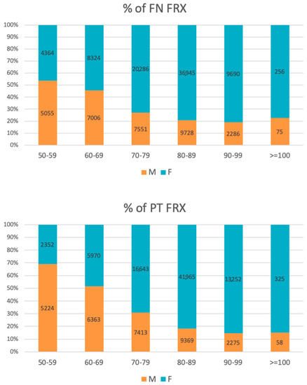 The incidence of HFs increased with advancing age, with a peak at 80–89 years of age, for both men and women, and then decreased (Figure 1). A similar trend was seen in the femoral neck (ICD10—S72.0), pertrochanteric (ICD10—S72.1), and other femoral fractures (ICD10—other S72). Over one-half of all femoral neck fractures occurred in women aged 80 years or over (58.7%), while in men they accounted for 37% (Figure 2).