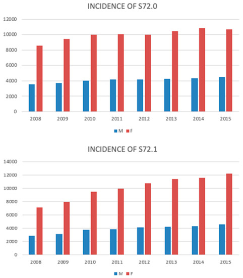 The incidence of the femoral neck (S72.0) and pertrochanteric fracture (S72.1) in men and women during the study period (2008–2015).