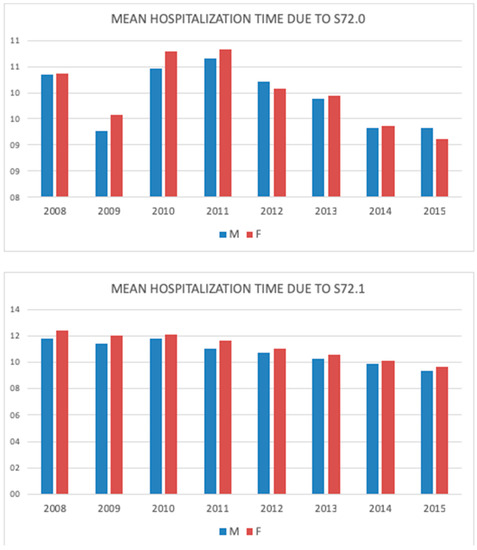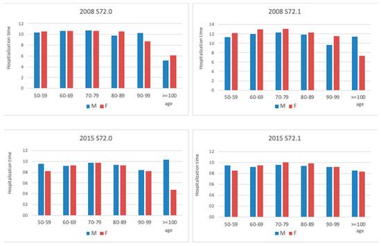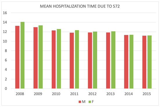 Mean hospitalization time due to the femoral neck (S72.0) and pertrochanteric fracture (S72.1) in men and women during the study period (2008–2015).
