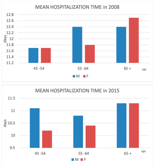 Mean hospitalization time decreased over the study period. In 2008 men spent, on average, 13.2 days in a hospital, while women were hospitalized for 14.1 days. Over time, the hospital stay (LOS—length of stay) has diminished. The difference between the hospitalization time of men and women has also decreased and was equalized to 11.2 days in 2015. Average hospitalization time shortened of 0.25 days/year for men, and 0.36 days/year for women (Figure 5).