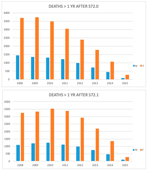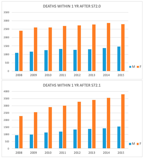Number of deaths after one year following femoral neck (S72.0) and pertrochanteric fracture (S72.1) during the study period.