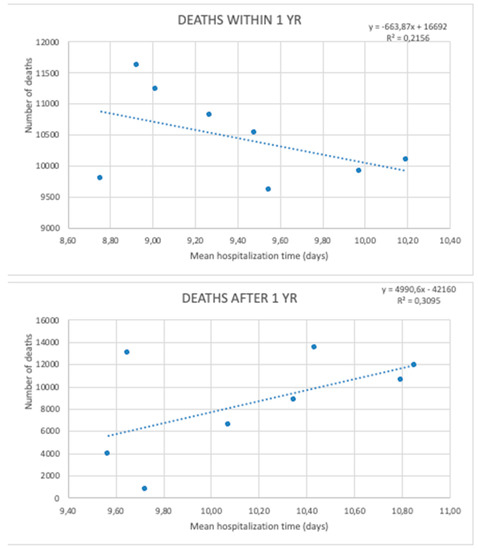 Regression models comparing hospitalization time and the number of deaths within and after one year after HF are presented in Figure 11 (p < 0.05).