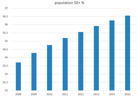 The nationwide population aged 50 years or over increased in Poland between 2008 and 2015 by over 8.5% and it accounted for more than 36% of the population in 2015, most recently reaching 37% [12] (based on data from 31 December 2018)—compared to 29% in the standard European population (Figure 12).