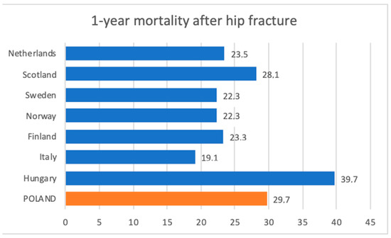 1-year mortality percentage after hip fracture—comparison between selected European countries. Calculations for Poland were made based on our data.