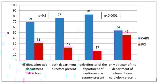 The primary objective of our study was to analyze the therapeutic recommendations of the multidisciplinary HT (CABG versus PCI) in patients with isolated multivessel disease. We analyzed the impact of the following scenarios: (a) The director of the department of cardiovascular surgery and the director of the department of cardiology were present during the HT meeting, (b) both department directors were absent, (c) only the director of one department (cardiovascular surgery or interventional cardiology) was present.