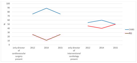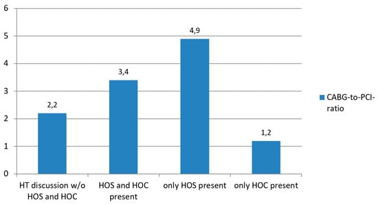 There is only one analysis available in the literature on variations in clinical decision-making between cardiologists and cardiac surgeons on a hospital-level [16] from 2006 before the introduction of the HT concept. The authors were able to demonstrate that there is a poor agreement between cardiac clinical specialists (cardiac surgeons, interventional cardiologists, and non-interventional cardiologists) in the choice of treatment offered to the patients [16], and this variation was most significant between surgeons and interventional cardiologists [16]. These results supported findings of other areas of clinical medicine where clinical specialists who perform a procedure are more likely to consider it appropriate in specific case scenarios [17]. Studies have shown that in 68% of patients undergoing PCI and 59% of those who underwent CABG, the alternative revascularization strategy was not discussed with the patient [18]. A multidisciplinary team and HT approaches were established to increase agreement among surgeons and cardiologists concerning the choice of treatment [3,16]. However, our study showed evidence that even after establishing the multidisciplinary HT concept in our tertiary referral hospital, the choice of treatment is influenced by the composition and the “clinical pecking order” of the HT. When only the director of the department of cardiovascular surgery was present at the HT meeting, the CABG-to-PCI ratio in multivessel disease was on average 4.88 versus 1.17 when only the director of the department of cardiology was present (p < 0.0001). This difference did not attenuate even after several years of HT interaction, which is in some contrast to evidence suggesting that the longer an HT has worked together, the more interactive, and successful it becomes [3]. However, if none or if both of the directors were present at the HT meeting, the CABG-to-PCI ratio was on average 2.70 without statistically significant differences over the years.