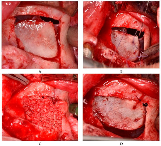 Suture of a perforation located at the superior edge of the osteotomy window. (A) The bone segment is still attached to the underlying mucosa. (B) Suturing of the Schneiderian membrane, along with the bone segment to the fixed bony plane. (C) “Hinge joint” of the mobile bone segment. (D) Grafting material introduced into the sinus cavity.