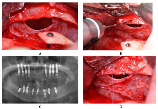 Iatrogenic perforation produced with a Langenbeck retractor. (A) Perforation located at the superior edge of the osteotomy. (B) Preparation of the holes in the bone. (C) Suture of the mucosa to the superior bony edge. (D) Postoperative panoramic image after implant placement.