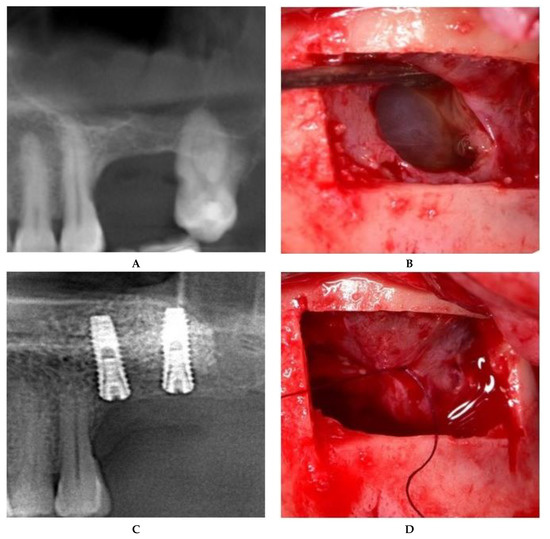 Sinus floor augmentation simultaneous with mucocele removal. (A) Preoperative CBCT of the left maxillary sinus. (B) Mucocele pseudocyst visible through the incision. (C) Suture of the incised Schneiderian membrane. (D) Panoramic image after implant placement.